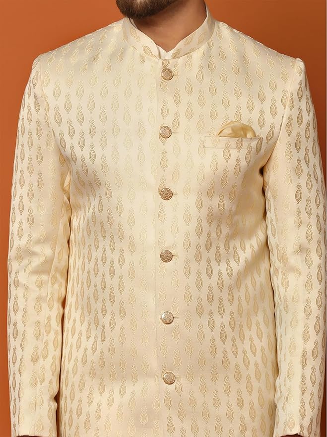 Imagine walking into a wedding or festive gathering with confidence, the cream cotton silk shining under the lights and the Indo-Western cut exuding sophistication. Whether groom, guest, or celebrant — this attire guarantees compliments and unforgettable memories.