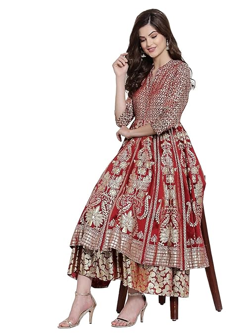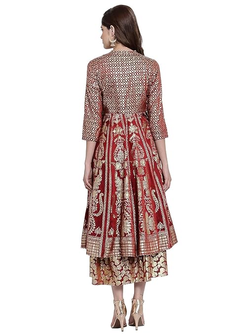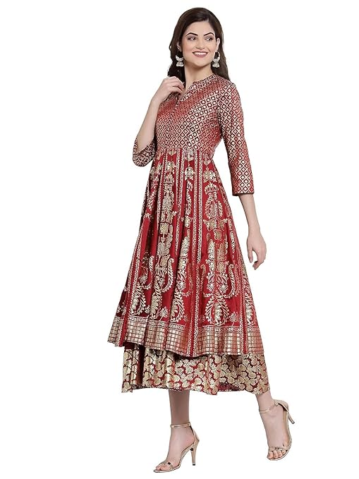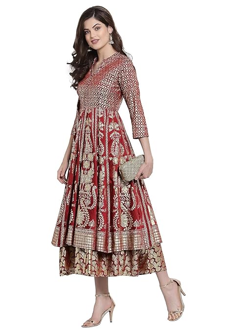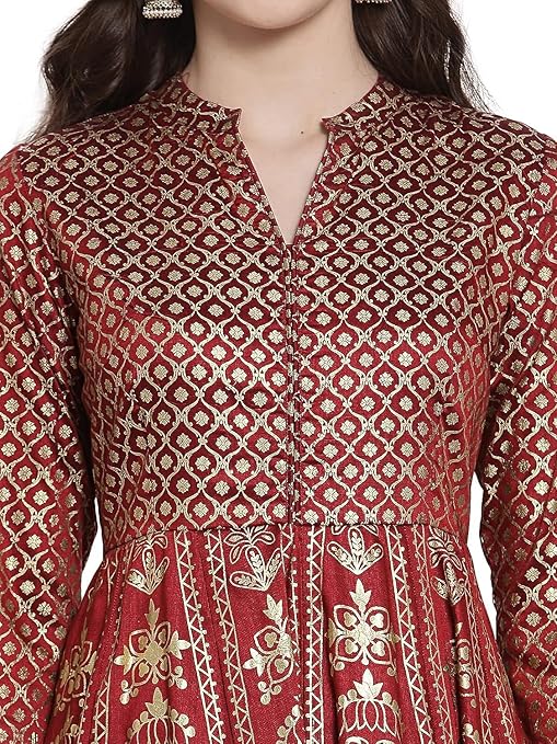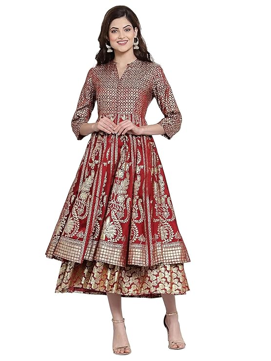The beauty of this ethnic dress lies in its foil-printed detailing and layered silhouette, giving you a graceful flow with every step. Its 3/4 sleeves and band collar design add a chic touch, while the turquoise and maroon palette brings a vibrant yet regal feel to any festive wardrobe.