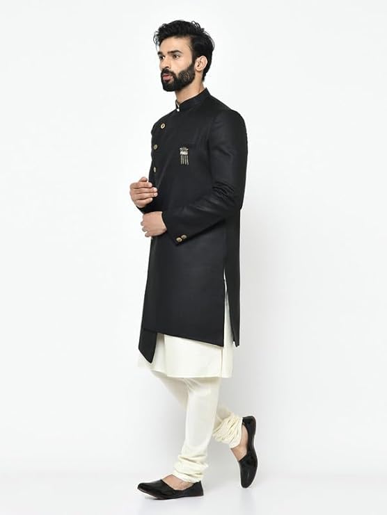 Step into your next celebration with confidence and grace wearing the KISAH Men's Indo-Western Kurta Sherwani Churidar Set. It’s more than just attire—it’s a reflection of tradition, confidence, and refined taste, crafted to make every occasion truly memorable.