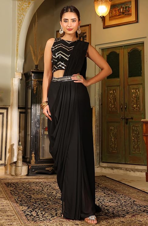 Some outfits don’t just elevate your look — they transform the moment. The Janasya Women’s Black Georgette Sequined Ready-To-Wear Belted Saree blends effortless draping with dazzling elegance, giving you the perfect festive look without the struggle of traditional pleats.