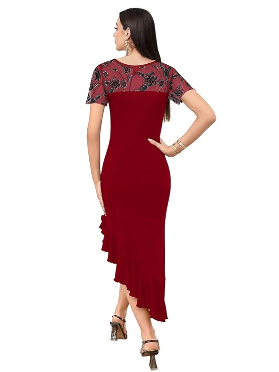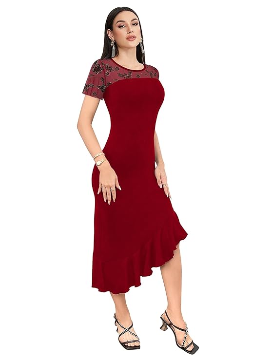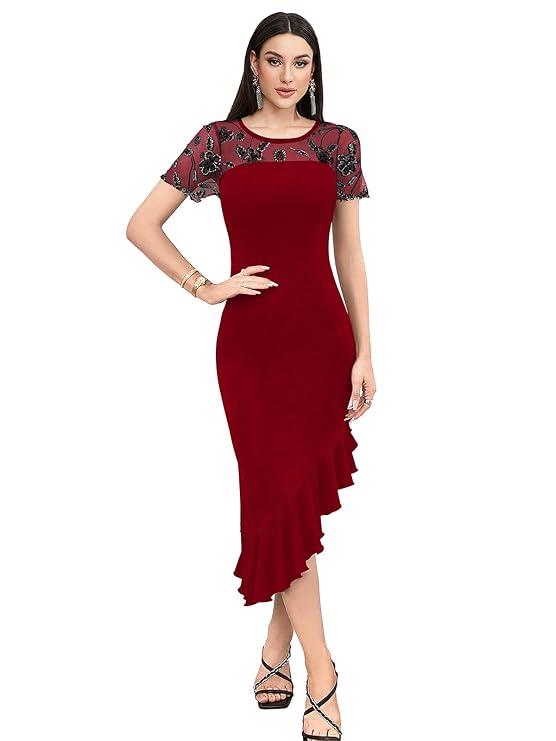 The Women’s Asymmetrical Contrast Mesh Ruffle Hem Midi Bodycon Dress invites you to embrace your feminine charm, express your personal style, and walk with the kind of confidence that never needs explanation. A dress for every mood, every moment, and every version of you.
