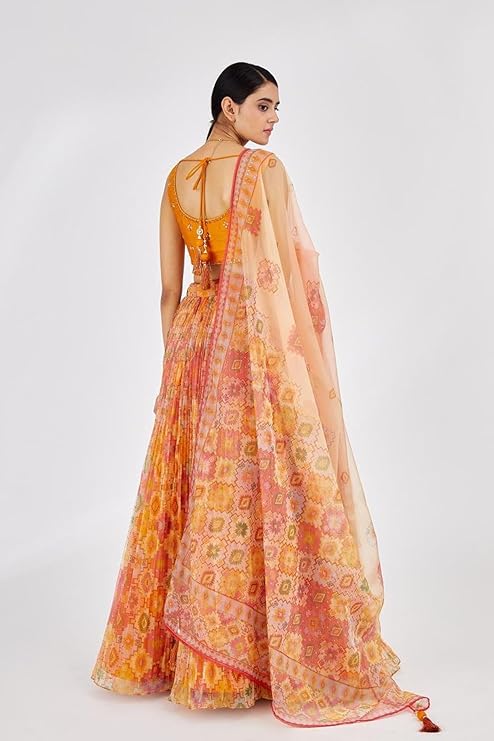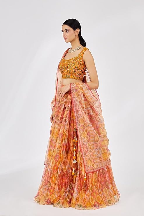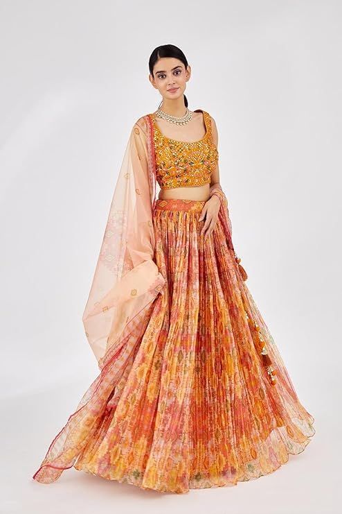 Festive fashion is more than clothing — it is a feeling, a moment, and a memory in motion. The Women's Organza Semi-Stitched Lehenga Choli brings that feeling alive with its sunlit yellow hue, digital print artistry, and graceful flow that turns every celebration into a story worth remembering. Whether for weddings, festivals, or unforgettable evening functions, this lehenga blends rich tradition with modern designer charm.