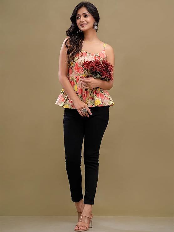 Feranoid Women Cotton Printed Sleeveless Strap Peplum Top.